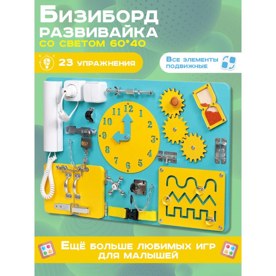 Бизиборд Малыш Смышленыш Стандарт 60х40 см с часами бирюзовый желтый